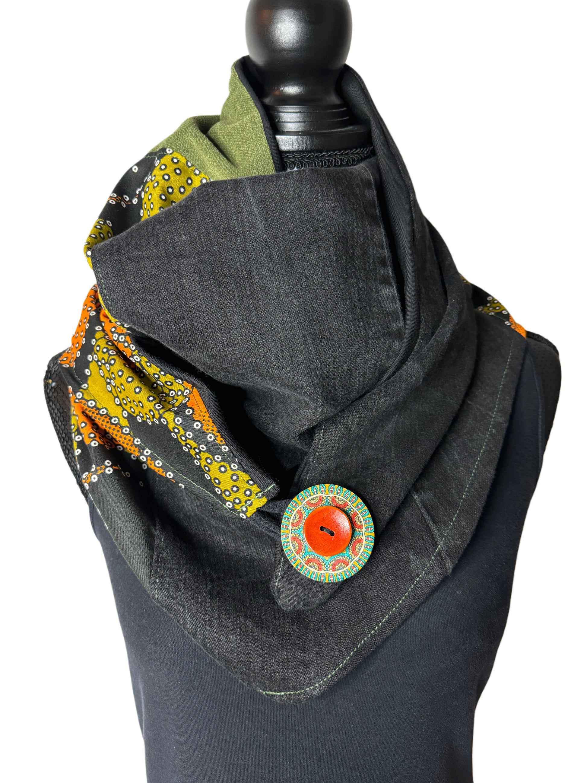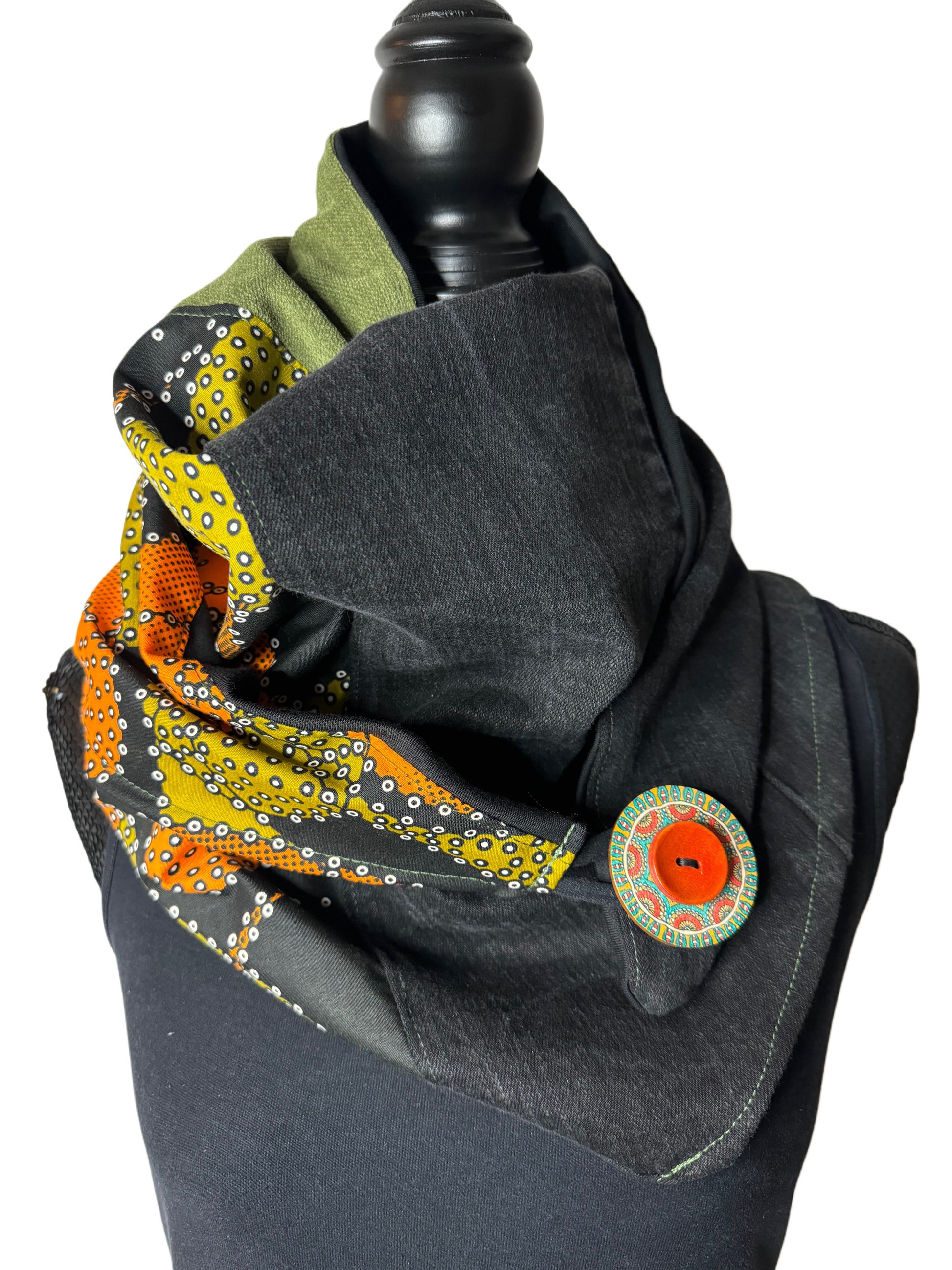 This hand-stitched scarf is made from a variety of recycled fabrics, including denim and other accessories. Its triangular shape and button closure allow for multiple ways to wear it . The scarf is soft, comfortable, and adds a unique touch to any look.