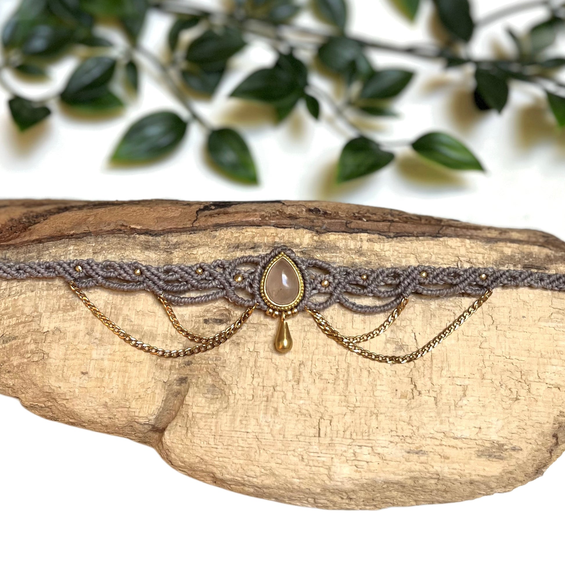 Makrame ogrlica je ročno izdelana iz visokokakovostnih vrvic, ki so izjemno trpežne. Vrvica je vodoodporna, barve so obstojne in ohranjajo svojo živahnost. V sredini je ročno oblikovan kristal, dopolnjen z medeninastimi perlicami in obeskom.