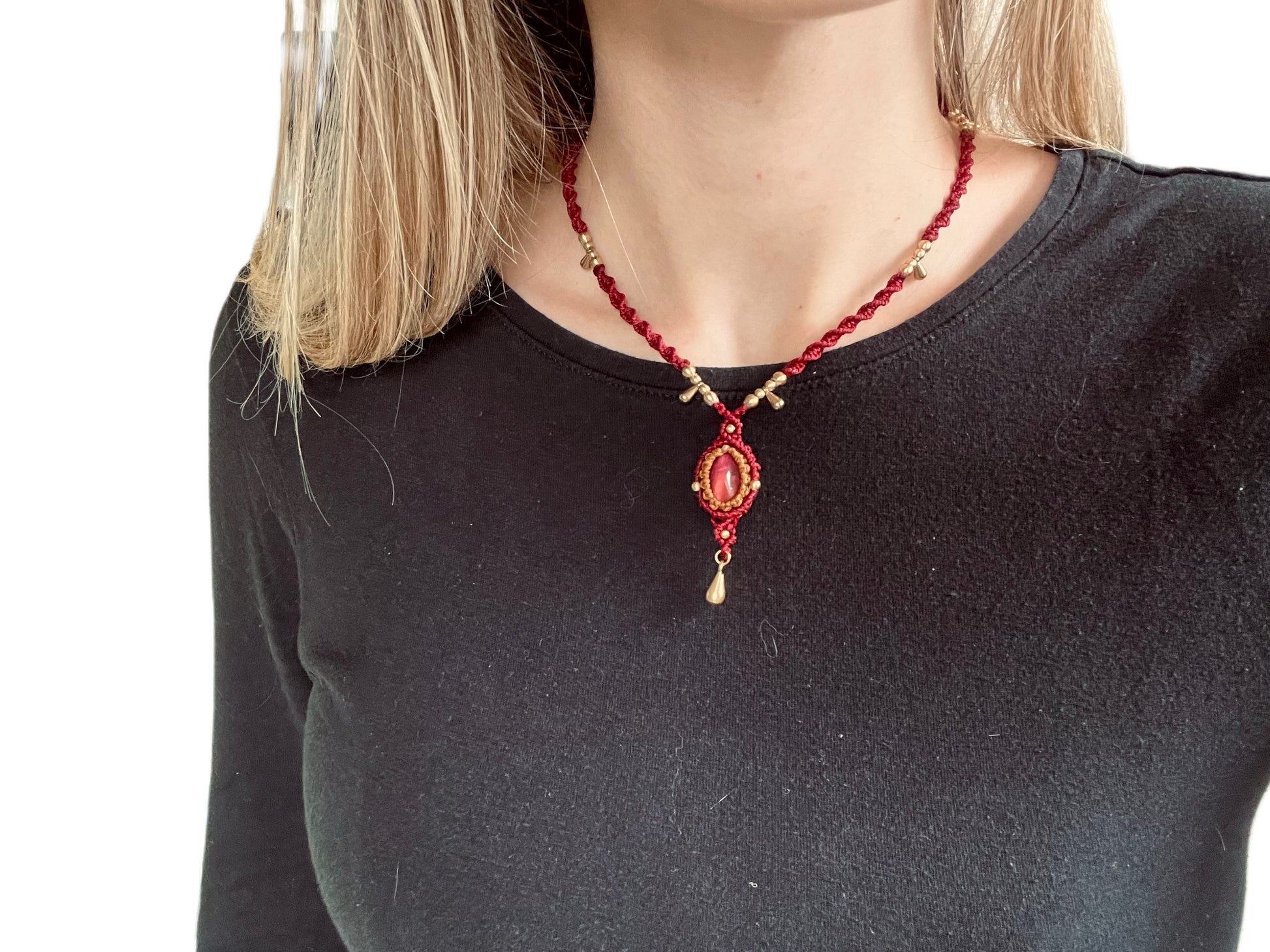 Makrame ogrlica je ročno izdelana iz visokokakovostnih vrvic, ki so izjemno trpežne. Vrvica je vodoodporna, barve so obstojne in ohranjajo svojo živahnost. V sredini je kristal Rožnato tigrovo oko (fuksija), dopolnjen z medeninastimi perlicami in obeskom.