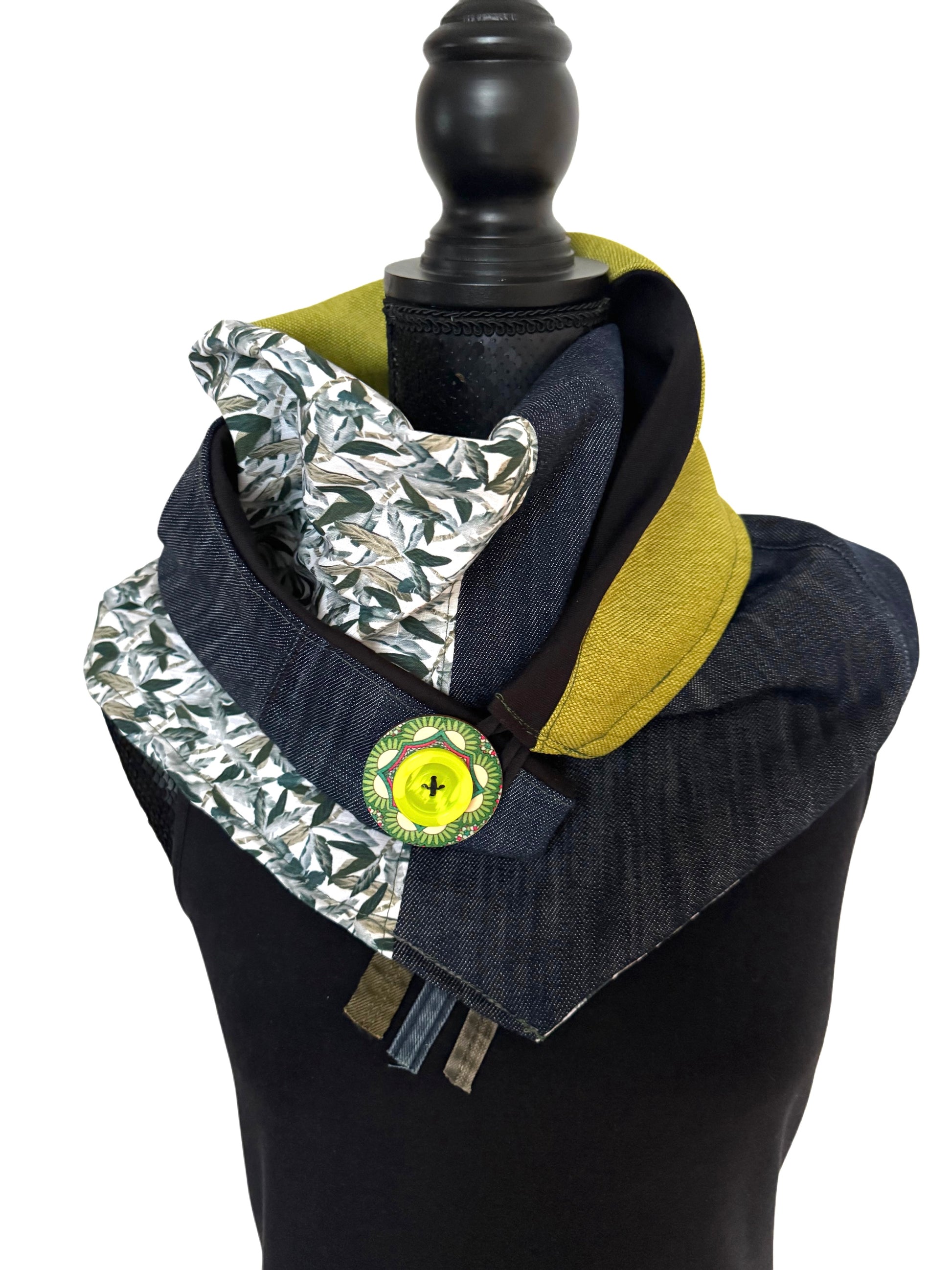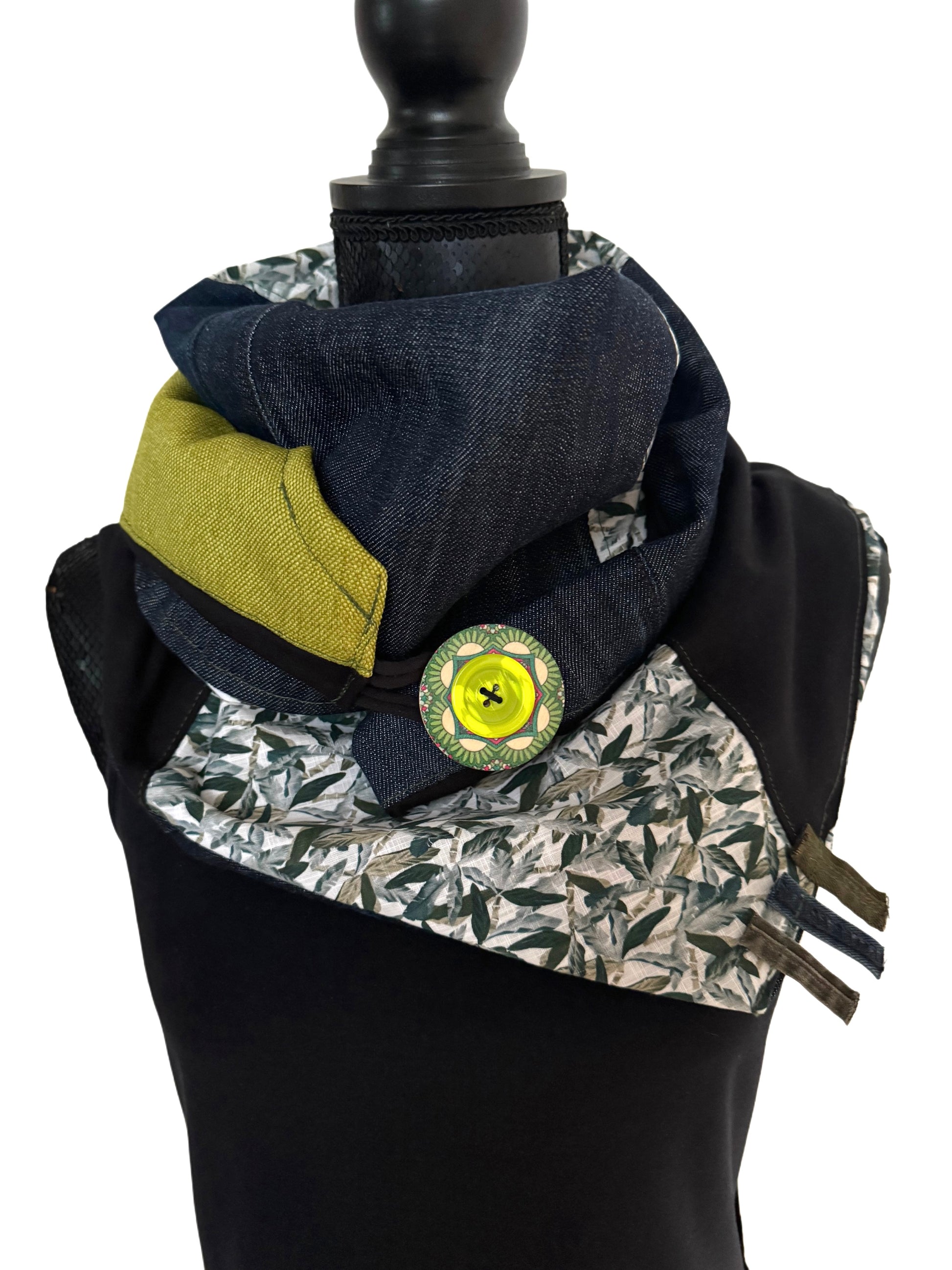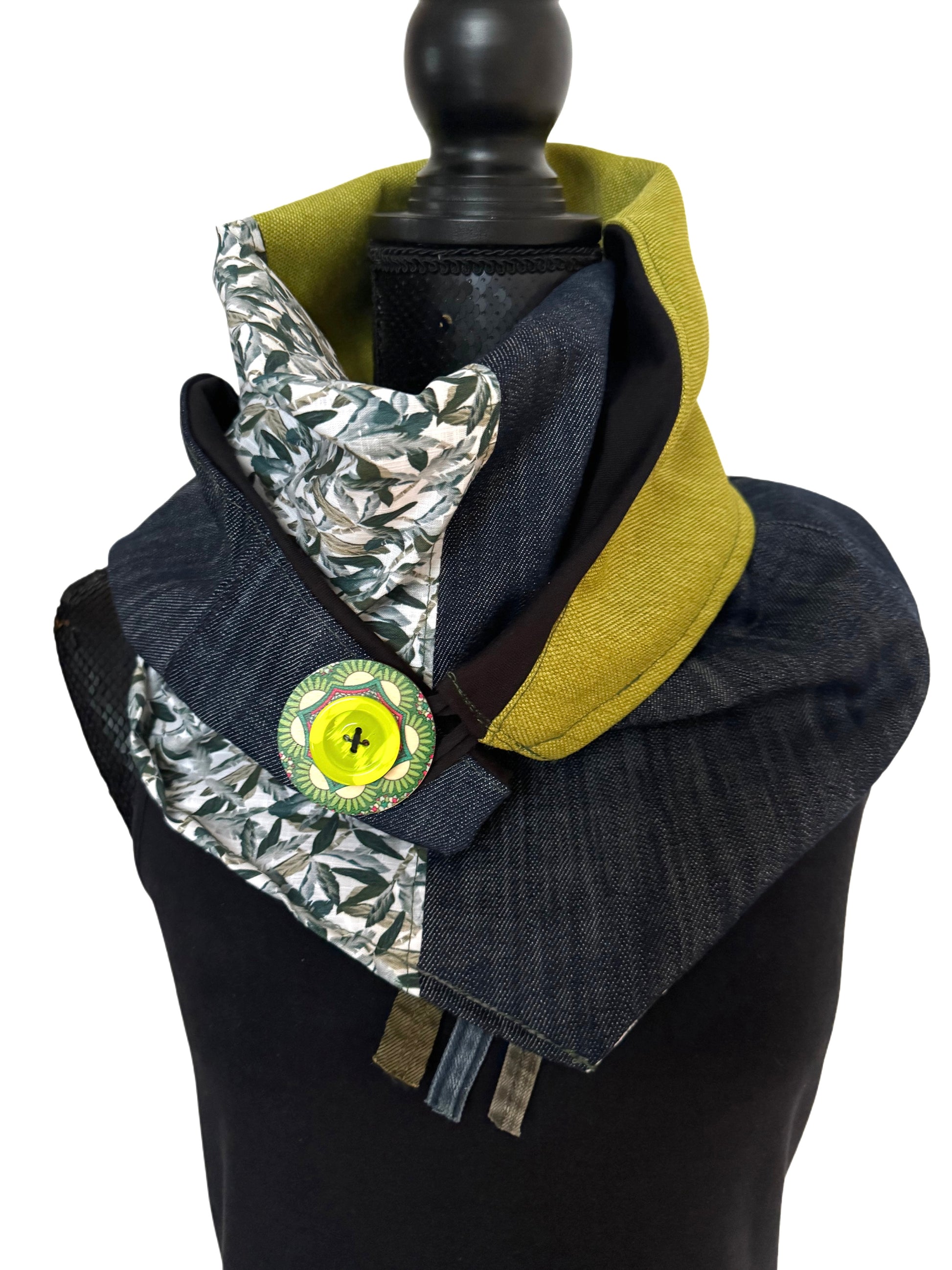 Ta ročno sešit šal je izdelan iz različnih kosov recikliranega blaga, vključno z jeansom in drugimi dodatki. Njegova trikotna oblika in zapenjanje na gumb omogočata več načinov nošenja. Šal je mehak, udoben in dodaja unikatno noto vsakemu stajlingu.